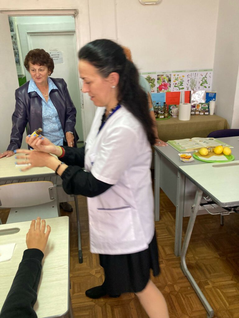 O superba activitate desfasurata azi, 23 oct.2025, în cabinetul de farmacie al școlii, cu musafiri de la Colegiul de Arte -cls.aIV-a, condusa de prof inv primar Carmen Coviza.